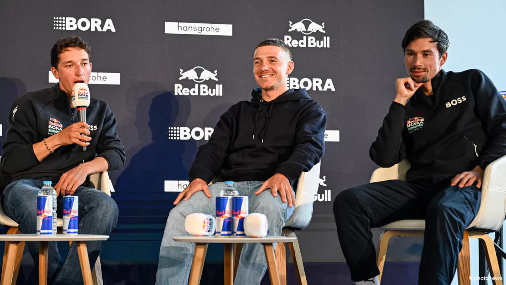 Glunderende gezichten in Spanje. Want Remco Evenepoel kan zich voor het eerst ‘presenteren’ als renner van Red Bull-Bora-Hansgrohe. Alleen: tijdens zijn trainingsritje draagt hij nog steeds de outfit van Soudal Quick-Step. En ook op de persconferentie schoof onze landgenoot als enige in ‘gewone’ kledij zonder sponsors aan. Hoe komt dat?