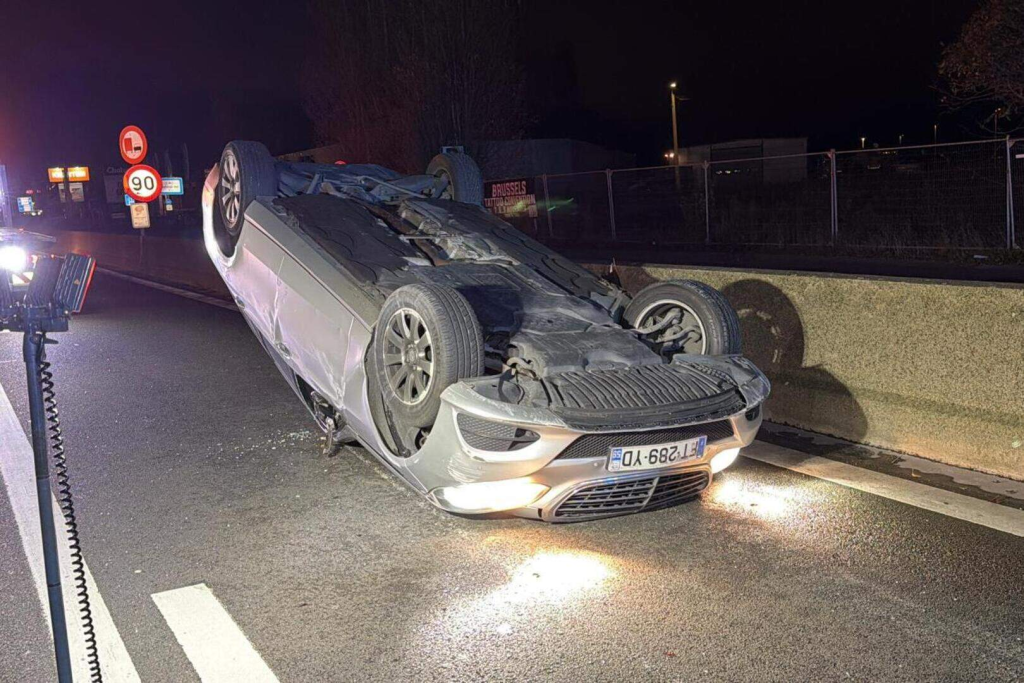 Op de A12 richting Antwerpen is zondagavond een wagen over de kop gegaan nadat de bestuurder over een betonnen zijwand reed. Eén inzittende raakte gewond en werd naar het ziekenhuis afgevoerd.