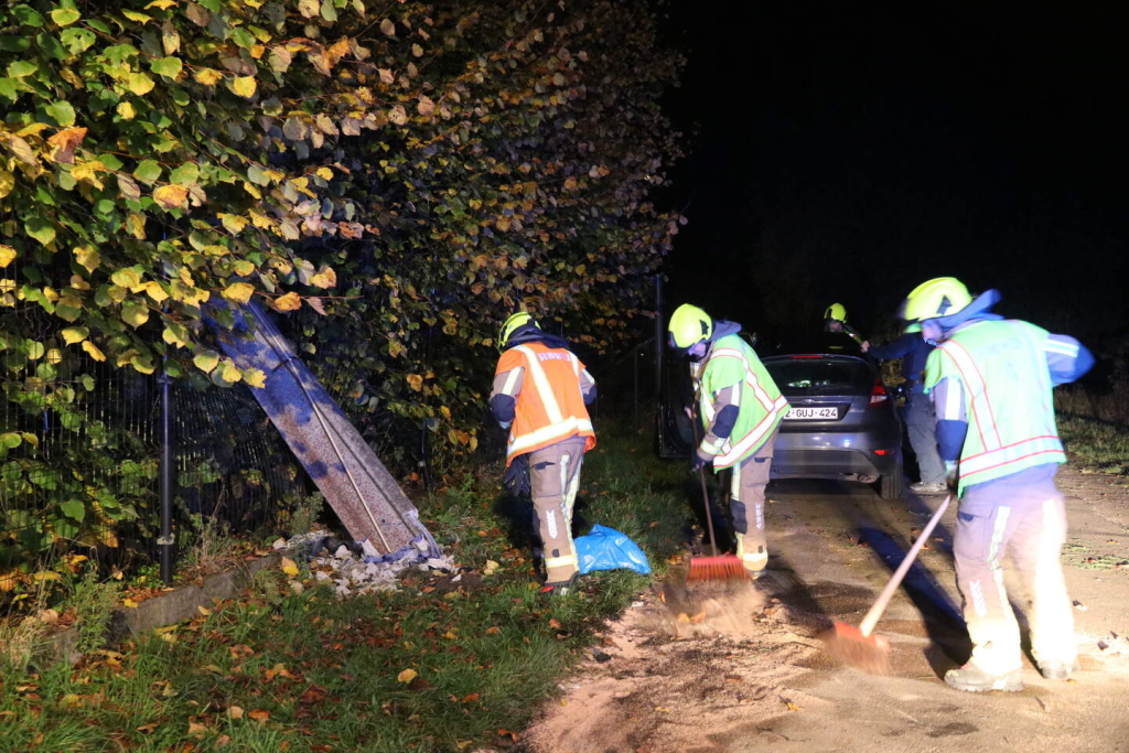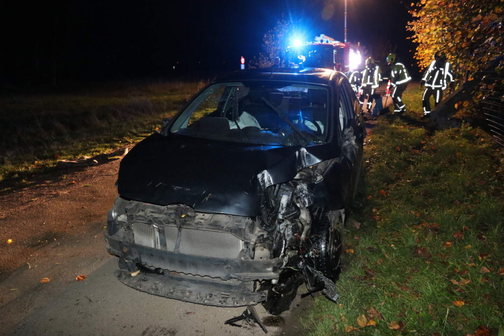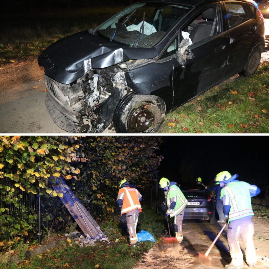 De klap moet bijzonder hevig zijn geweest want de verlichtingspaal knakte af en kwam op een omheining en enkele bomen terecht. De twee inzittenden, twee jonge mannen, bleven als bij wonder ongedeerd.