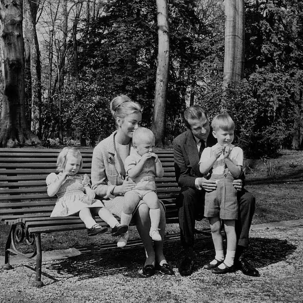 Prinses Astrid, moeder Paola met prins Laurent en vader Albert met koning Filip in 1965
