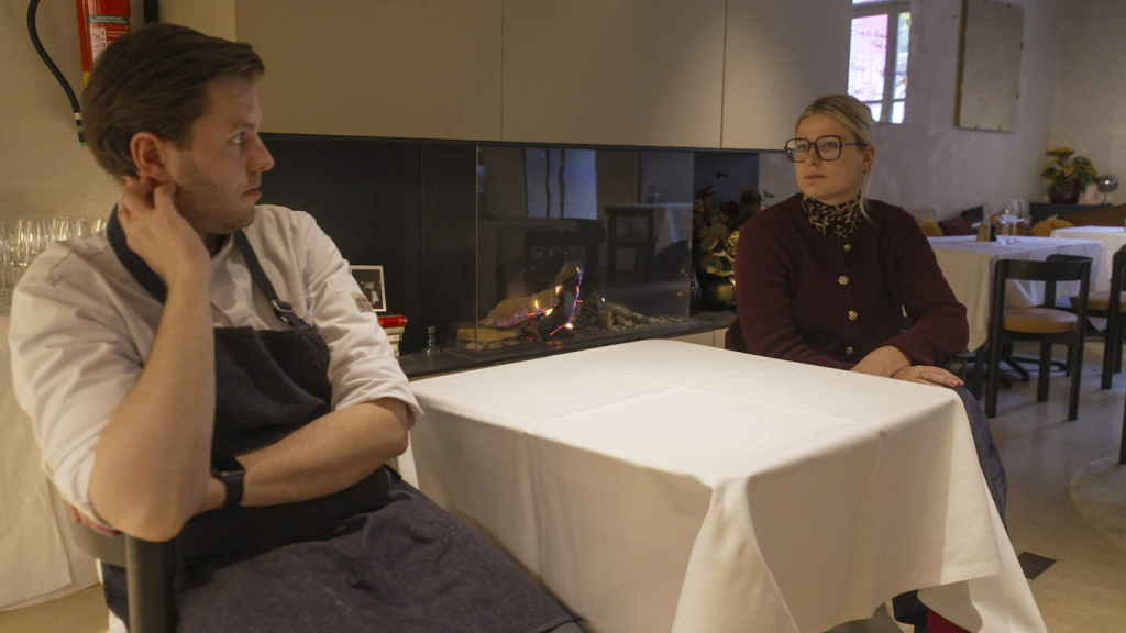 Aristide en Charlotte zitten verveeld met de slechte service tijdens het jurybezoek. © VTM