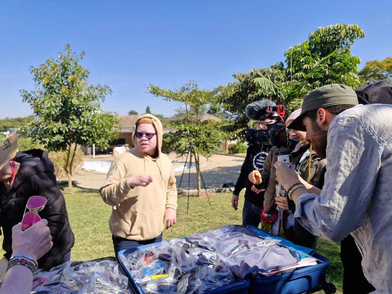 Filmmaker Geerard Adriaen (uiterst rechts) aan het filmen in Zimbabwe.