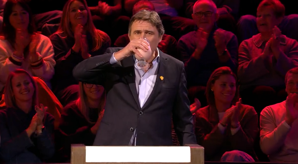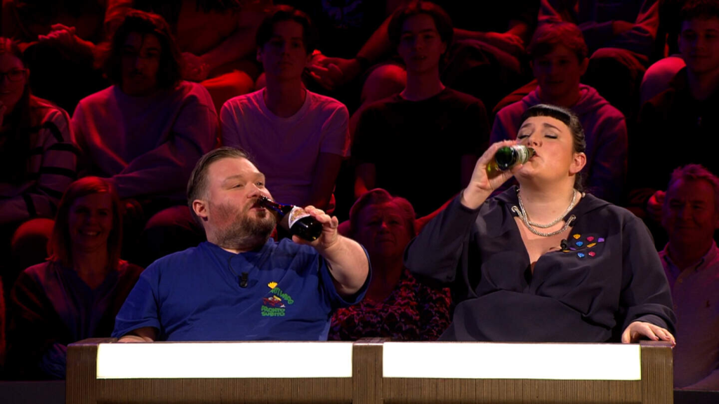 De openingsronde 3-6-9 begon ook met een biergerelateerde vraag. Of moeten we het een blasfemie tegen de Duvel noemen? Want wat is een ‘Dusti’ wou Erik Van Looy weten. Wat blijkt: het is een Duvel gemengd met een Fristi. U kokhalst nu? Ja, dat is de enige juiste reactie, zouden we durven zeggen. “Ik zie hier de CEO bijna van zijn sus draaien”, zei Jens Dendoncker terwijl zijn ogen naar het publiek, waar vader Moortgat zit. “Je wordt daar dus terug nuchter van als je dat drinkt”, gaf Boeva nog mee. “Je drinkt, en dan ‘spouwt’ ge alles uit, en ben je terug nuchter.”