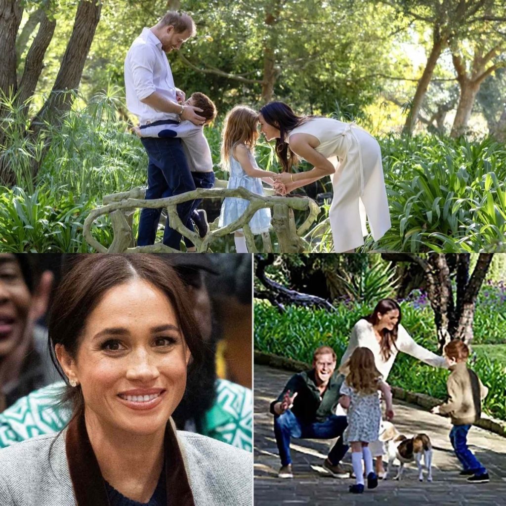 Op de foto poseert het gezin bij een bruggetje in een bosrijke omgeving. De 6-jarige prins Archie omhelst op de foto zijn vader, terwijl Meghan de handen van de 4-jarige prinses Lilibet vasthoudt en iets tegen haar lijkt te zeggen.