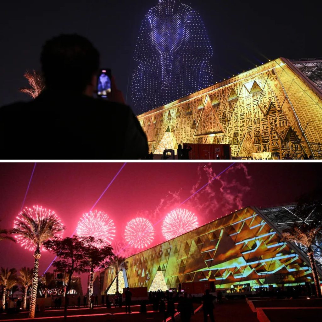 De Egyptische overheid had van deze dag een betaalde feestdag gemaakt en spaarde kosten noch moeite. Er was een uitbundige ceremonie met dansers in kleurrijke en gouden faraonische kostuums. Boven het gebouw werd vuurwerk afgestoken en vormden drones afbeeldingen van oude Egyptische goden, de piramides op de achtergrond werden verlicht met kleurrijke lampjes.