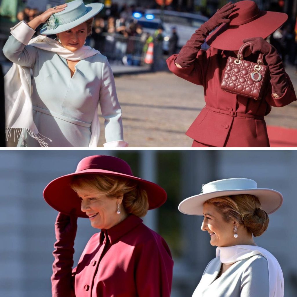 Dat ontvangst ging gepaard met een troepenbeschouwing, de volksliederen en een fotomoment op het Paleizenplein. Maar dat was buiten storm Benjamin gerekend. Die raasde donderdag over ons land, maar ook op vrijdag werden er nog stevige windvlagen gerapporteerd. En dat hebben koningin Mathilde en groothertogin Stéphanie geweten. Zij moesten meerdere keren hun hoe goed vasthouden om te vermijden dat die zou wegvliegen.