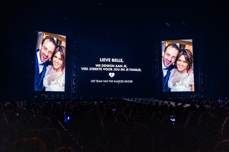 Op de gigantische schermen verscheen een foto van Belle en haar echtgenoot, vergezeld van een tekstje. “Lieve Belle, we denken aan je. Veel sterkte voor jou en je familie”, zo viel er te lezen op het scherm. De boodschap werd ondertekend door het voltallige team van het VTM-programma. Het publiek reageerde massaal met een warm en respectvol applaus.