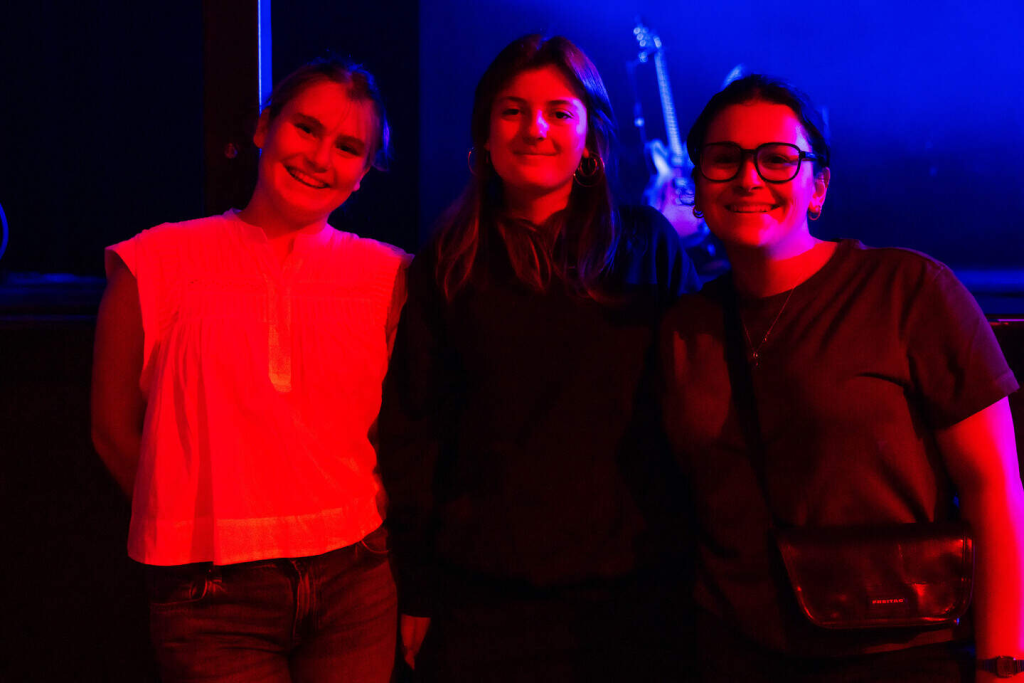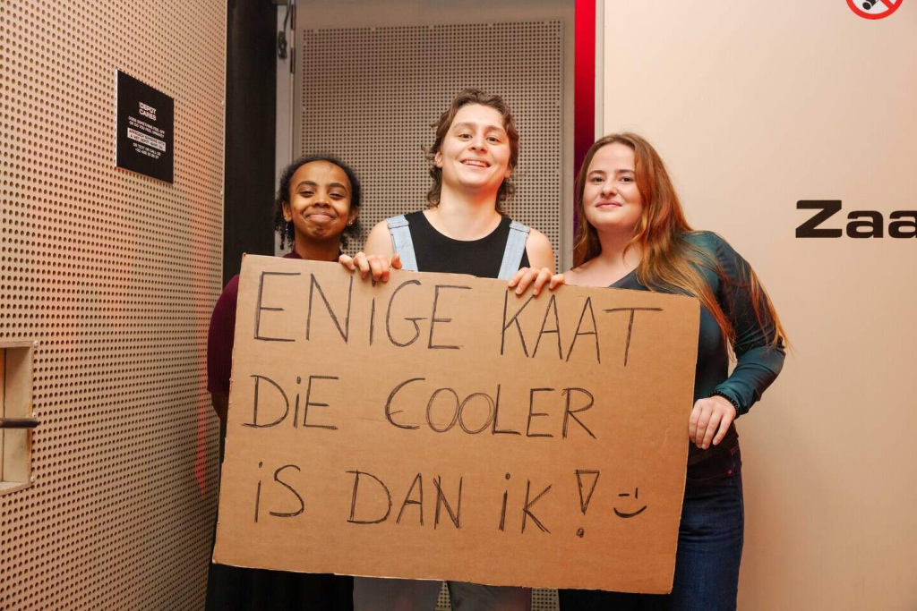 Voor de show praten we ook met drie vrolijke vriendinnen uit de Kempen. Nona Peeters (19), Elouise Reynders (20) en Joske Boeckx (18) zitten op kot in Leuven. “Handig, en het ticket was heel goedkoop.” Ze zeggen dat ze de muziek van Kaat Van Stralen wel kennen – zeker hitsingle ‘Stop met wenen’ – maar dat ze er vooral zijn voor de vibe.