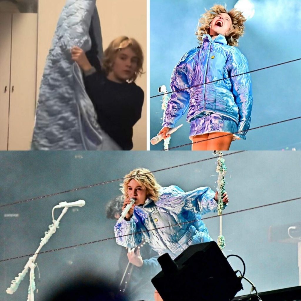 In een TikTok-filmpje toont ze hoe ze met een stuk karton, een schaar en een naaimachine haar eigen jas en rokje in elkaar steekt, vertrekkende van… een bedsprei. Het eindresultaat mag gezien worden. De zangeres straalde dinsdagavond in haar outfit op het dak van Het Warmste Huis.
