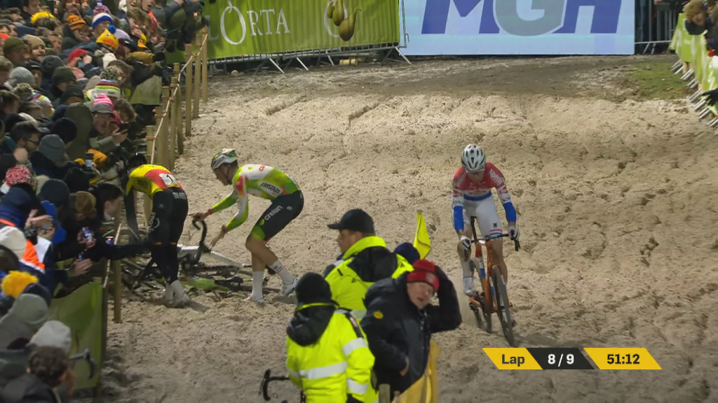 Maar het is niet dat het er helemáál niet in zit. Want in de tweede ronde kwam Nys uitgerekend na een goeie beurt door het zand alleen te zitten in de achtervolging op de ontsnapte Tibor Del Grosso.Na een jacht op het scherpst van de snee kwam Nys eindelijk aansluiten. Tot dat moment in de vierde ronde…“Ik had heel veel moeite met het zand”, zei Nys achteraf. “Maar ik had ook niet de meest frisse benen. Dat voelde ik op de Regimentsberg, waar ik niet van beneden tot boven kon doortrekken. Dat was wel de bedoeling, want ik dacht dat ik dat zou nodig hebben om het vandaag naar mij toe te trekken.”