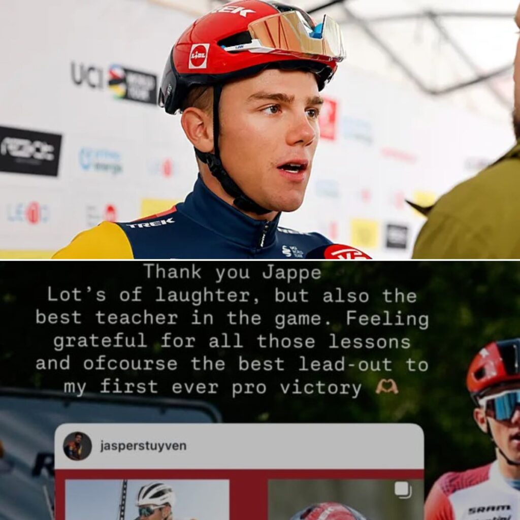 “Bedankt, Jappe! We hebben veel gelachen samen, maar je bent ook gewoon het beste voorbeeld in het wielrennen. Ik ben erg dankbaar voor al die lessen die je me hebt gegeven, en natuurlijk ook de beste lead-out voor mijn eerste profzege ooit”, klinkt het daar.