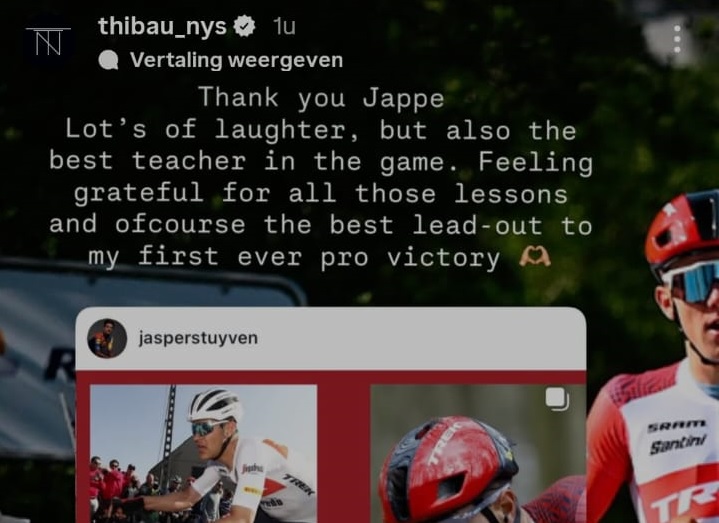 Want zo zwaaiden die Jasper Stuyven immers officieel uit. Onze landgenoot trekt straks naar Soudal-Quick Step, na 12 jaar bij Trek. Ook Nys neemt afscheid van zijn geliefde collega met enkele fraaie woorden. Dat deed hij via Instagram.