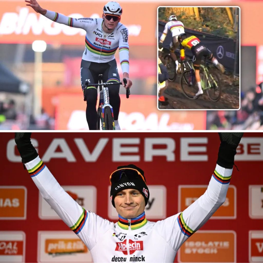 De wereldkampioen plaatste zijn enige échte versnelling van de cross, maar dat was genoeg om nog tweeënhalve ronde alleen te rijden en solo te finishen. Goed voor zijn vijfde zege op een rij in Gavere en ook zijn vijfde overwinning van dit seizoen. Met zijn overwinning nadert Van der Poel nu zelfs al tot op één punt van Wereldbeker-leider Laurens Sweeck.